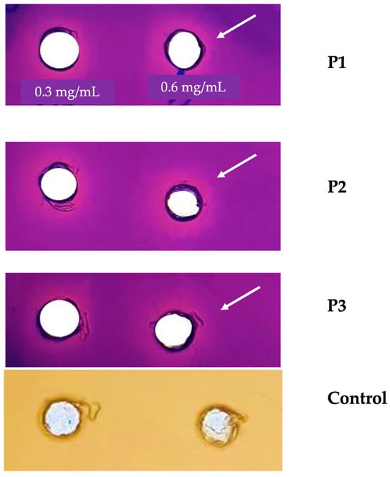 Anti-QS properties of propolis. P1: Euphorbia resinifera propolis. P2 and P3: Euphorbia officinarum propolis. N-hexanoylhomoserine lactone (C6-HSL) at 0.12 µg/mL was added to the culture medium. Control: No addition of C6-HSL to the culture medium. The white arrow highlights the concentration (0.6 mg/mL) at which the zone of inhibition of the production of the pigment violacein is observed. The assay was conducted using three independent triplicates.