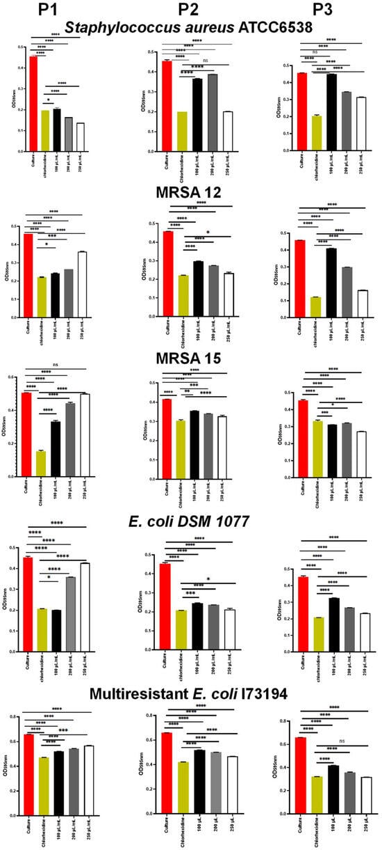 Inhibition of the bacterial adherence by the propolis samples P1, P2 and P3. Data represent the mean of three biological replicates. Error bars represent the standard deviation. * p < 0.05. ** p < 0.01. *** p < 0.001. **** p < 0.0001. ns: not significant.
