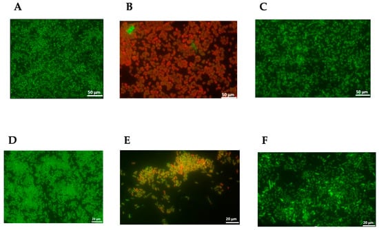 The impact of the E. resinifera (P1) propolis hydro-alcoholic extract on the disruption of biofilm formed by MRSA12 ((A) control, no exposure to anti-biofilm agent; (B) after exposure to propolis P1; (C) after exposure to 70% ethanol) and multiresistant E. coli I73194 ((D) control, no exposure to anti-biofilm agent; (E) after exposure to propolis P1; (F) after exposure to 70% ethanol). The bacterial cells formed a biofilm over 24 h and were visualized after staining with LIVE/DEAD Baclight.