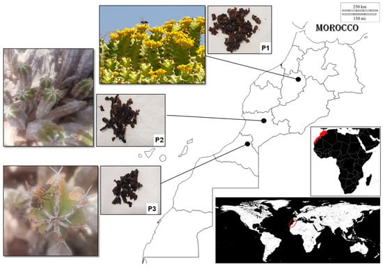 From right to left, the geographical location of Morocco and of the apiaries where the samples of Euphorbia resinifera (P1) and E. officinarum propolis (P2 and P3) were obtained. On the left are the flowers and propolis of E. resinifera (P1) and E. officinarum (P2 and P3).