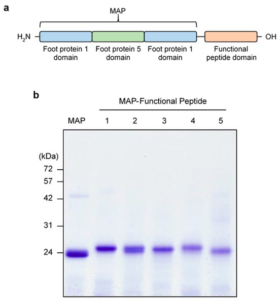 Many different proteins, which are derived from living organisms such as metabolites and components of some species, have been tried as biocompatible materials to apply pharmaceutics and medical devices. Although many AMPs were developed in a few decades, there were some limitations, such as low stability and cytotoxicity. To overcome the limitations of AMPs, MAP-derived recombinant protein system was used to give stability and safety to AMPs. Since recombinant mussel adhesive proteins, MAP fp-151, have been developed as biomaterial, having stability and cost-effective manufacturing was used as a scaffold for recombinant AMPs. MAP fp-151 was composed as fp1-fp5-fp1, derived from Mytilus edulis [23]. To make MAP-fused functional peptide for anti-microbial application, a number of antibiotic peptides originating from AMPs and proapoptotic peptides were fused to C-terminal of MAP fp-151 (Figure 1a). Anti-microbial-activity-associated peptides, including AKRHHGYKRKFH from anti-microbial histatin 5-derived P-113 (MAP-FP-1) [24], LKKLAKLALAF from anti-cancer peptide (MAP-FP-2) [25], THRPPMWSPVWP from transferrin receptor binding peptide (MAP-FP-3) [26,27], ILRWPWWPWRRK from anti-microbial omiganan (MAP-FP-4) [28,29], and KLAKLAKKLAKLAK from proapoptotic/anti-microbial KLAK peptide (MAP-FP-5) [30,31], were selected for MAP-fused functional peptides (MAP-FPs) (Table 1). Recombinant MAP-FPs were overexpressed and purified as previously described [21]. Since overexpressed recombinant MAP-FPs were aggregated as an inclusion body in E. coli, they lost anti-microbial activity and could be purified. Purified recombinant MAP-FPs showed >80% purity, as determined by SDS-PAGE (Figure 1b).