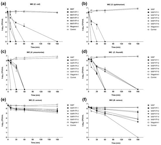 To check the time-dependent microbicidal activity of MAP-FPs, TKK assay was performed on six microbial strains. TKK of MAP-FPs was investigated using the CFU counting method after indicated times, 0, 10, 30, 60, and 180 min with 1 × MIC of MAP-FPs. Since some MICs have not yet been determined, for all MAP-FPs against Gram-positive bacteria and MAP against K. pneumoniae and C. freundii, 8 µM was used as 1 × MIC of MAP-FPs and Magainin I. Time-kill kinetics of 1 × MIC MAP and MAP-FPs showed all four Gram-negative bacteria were killed within 180 min, but Magainin I did not (Figure 2a–d). S. typhimurium and K. pneumoniae were killed within 60 min with MAP and MAP-FPs (Figure 2b,c). Similar to the findings of a previous MIC study, MAP-FP-2 and -5 showed the fastest antimicrobial effects and could kill E. coli, S. typhimurium, and K. pneumoniae within 30 min (Figure 2a–c). Although none of the 1 × MIC MAP-FPs killed S. aureus (Figure 2e), MAP-FP-5 killed B. cereus within 180 min (Figure 2f). A 1/4 × MIC of MAP-FPs killed all Gram-negative bacteria except C. freundii within 180 min (Figure S1a–f). Compared with the TKK of 1 × MIC results, it was observed that even smaller amounts of MAP-FPs also killed susceptible bacteria within 180 min. These results demonstrate the direct microbicidal effects of MAP and MAP-FPs against susceptible Gram-negative bacteria.