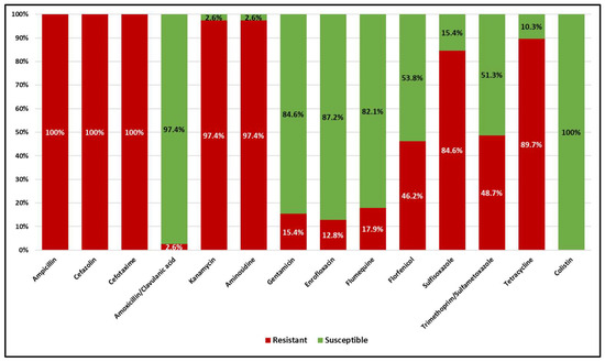 All E. coli isolates were phenotypically positive for the double-disk synergy test (DDST), confirming the production of ESBL. However, all of them were susceptible to the carbapenem class. Based on the MIC results (Figure 1), the highest level of resistance was observed for β-lactams, with all isolates being resistant to ampicillin, cefazolin, and cefotaxime (100%), while only 2.6% of isolates were resistant to amoxicillin/clavulanic acid. Concerning aminoglycosides, 97.4% of isolates were resistant to kanamycin, 97.4% to aminosidine, and 15.4% to gentamicin. Concerning fluoroquinolones, 12.8% were resistant to enrofloxacin and 17.9% to flumequine. Resistance to florfenicol was 46.2%. Concerning sulfonamides, 84.6% were resistant to sulfisoxazole, and 48.7% to trimethoprim/sulfamethoxazole. For the tetracycline class, 89.7% of isolates were resistant. All isolates were susceptible to colistin (100%). Notably, all ESBL E. coli isolates were MDR, being resistant to at least three classes of antibiotics. The MIC results are detailed in Supplementary Materials File S1.