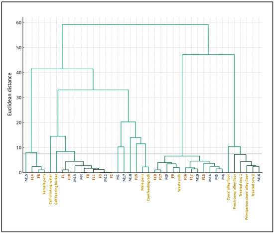 Based on the threshold Euclidean distance of 7.5, several statistically significant clusters grouped more than one sample. The largest cluster included 11 calf isolates and the waste milk isolate. The second largest cluster included the isolates from nine calves, closely related to the common feeding bucket and the calf drinking water. The third largest cluster grouped the isolates from one calf, treated cows, and the primiparous and fresh cow alleys, indicating fecal shedding from treated cows as another diffusion route. The fourth one included two female calf isolates and the female calf pens. The other four calf isolates, the male pens, and the cow feeding rack also had similar AMR profiles.