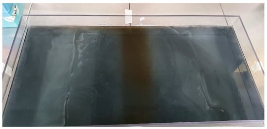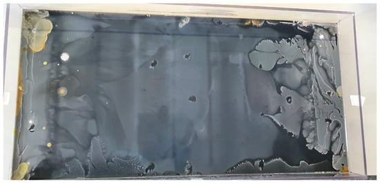 The experiments were conducted in a 60 cm × 30 cm polycarbonate tray constructed from 5 mm thick material (Innoterm Ltd., Budapest, Hungary) and bonded together using waterproof tetrahydrofuran adhesive. To facilitate the separation of media with varying antibiotic concentrations in the lower layer, the bottom of the tray was divided into nine equal compartments. Prior to usage, the tray underwent disinfection by filling it with a 7.5% hydrogen peroxide solution (VWR International Kft., Debrecen, Hungary) [,], followed by wiping the inner surface and rim of the cover plate with a 1% sodium hypochlorite aqueous solution (Merck KGaA, Darmstadt, Germany). Subsequently, it was placed in a sterile chamber for 15 min, after which the hydrogen peroxide was removed using a vacuum pump and a 30 min UV light treatment was administered.