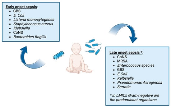 The most frequent bacteria involved in EOS are Group B Streptococcus (GBS—43%) and Escherichia coli (29%) []. The main risk factors for EOS are maternal chorioamnionitis, an amniotic membrane rupture lasting for more than 18 h and untreated GBS colonization. Despite the majority of the guidelines defining EOS as an infection that manifested within the first 72 h of life, an infection caused by GBS, despite the perinatal etiology, could occur within the first 7 days of life []. Late-onset sepsis (LOS) is usually defined as an infection that occurs after the first 72 h of life; it is associated with infants who remain hospitalized for a long time and/or with a compromised immune system. As previously reported, some authors considered LOS as sepsis occurring 8 days after being born []. It is associated with preterm babies, or full-term newborns that required prolonged ventilation or invasive procedures, and the microorganism of LOS are pathogens acquired in a hospital setting. The other important risk factors for LOS are the administration of H2 blockers, prolonged empirical early antibiotic therapy, catheters, and skin lesions [,,]. It is important to underline that LOS can manifest also after discharge. The most common pathogens in high-income countries are Gram-positive organisms, including coagulase-negative staphylococci (CoNS) and streptococci []. In LMICs, Gram-negative bacteria are the predominant organisms [,,].