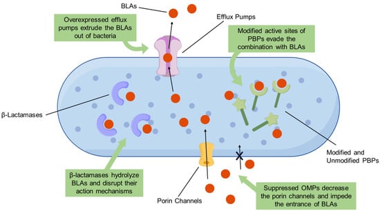 Proposed bacterial mechanisms of resistance to β-lactam antibiotics (BLAs), including the production of β-lactamases, the modified active sites of penicillin-binding proteins (PBPs), and down-regulated outer membrane proteins (OMPs).