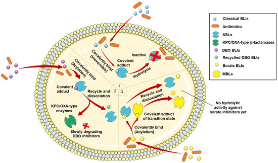 Main inhibitory mechanisms of β-lactamase inhibitors (BLIs). 1: The classical BLIs are mainly characterized as suicide inactivators, combining with serine residue at active sites and inactivating β-lactamases. 2: The first generation of non-β-lactam diazabicyclooctane (DBO) BLIs mediate reversible acylation reactions to inhibit SBLs. 3: The second generation of non-β-lactam borate BLIs can form a covalent adduct transition state to reversibly inhibit both serine-β-lactamases (SBLs) and metallo-β-lactamases (MBLs). KPC and OXA denote Klebsiella pneumoniae carbapenemase and oxacillin-hydrolyzing enzymes, respectively.