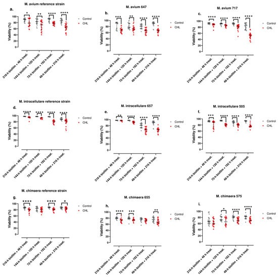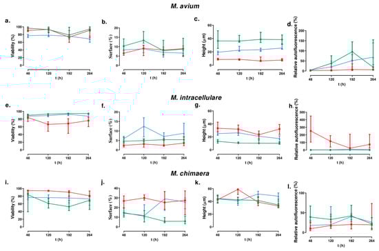 The time evaluation of the viability for the M. avium strains showed that no differences can be detected for the reference strain (p-value = 0.1212), but there are differences for the clinical strains (p-values = 0.0052 and 0.0018 for strains 647 and 717, respectively). For M. intracellulare, the variation was observed for the reference strain (p-value < 0.0001) and strain 657 (p-value = 0.0248) but not for strain 505. For M. chimaera, the variation showed similar characteristics as M. intracellulare (p-values = 0.0.0227 for the reference strain and 0.0003 for strain 655, but no significance for strain 575).