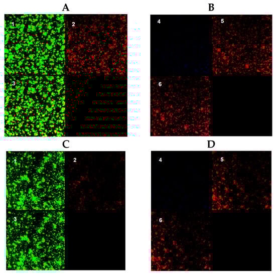 Images obtained for a 48 h biofilm of M. avium (A,B) and M. intracellulare (C,D). (A,C): BacLight© Live–Dead stain. (B,D): Autofluorescence and Nile Red stain. 1: Live bacteria; 2: dead bacteria; 3: merged Live–Dead bacteria; 4: autofluorescence; 5: Nile Red stained bacteria; 6: merged autofluorescence–Nile Red stained bacteria.