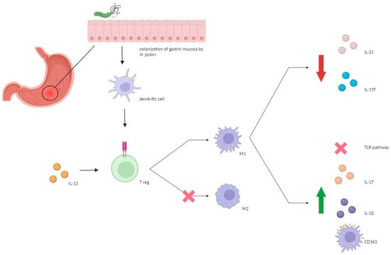 Upon the activation of Toll-like receptors (TLRs) by H. pylori, dendritic cells (DCs)—crucial in modulating adaptive immunity—can activate T cells, potentially inducing either a Th1 or Th2/Treg cell response by generating IL-12 or IL-10, respectively []. As we already mentioned, the importance of Treg in the pathogenesis of IBDs is widely recognized [,]. Thus, a protective role of H. pylori infection against IBDs may be due to the ability of this microbe to downregulate pro-inflammatory immune pathways such as Th1/Th17 pathway by inducing a shift from M1 to M2 macrophage lineage [,,]. This shift is associated with decreased levels of IL-17F and IL-21, suppression of TLR-mediated signaling pathways, along with increased expression of IL-10 and Treg cells, possibly due to elevated plasma IL-13 levels [,]. Moreover, increased anti-inflammatory responses may occur through elevated expression of CD163, a scavenger receptor primarily found on macrophages and monocytes, which is positively regulated by IL-10 and is upregulated during the M2/M1 phenotype switch, indicating its involvement in inflammatory processes [,]. Studies showed that individuals infected with H. pylori have increased numbers of CD163+ and CD163+/IL-10+ M2 monocytes, with higher IL-10 production by M2 cells (Figure 1) []. Regarding the CagA-positive strain, it has been observed to elicit a higher production of beta-defensins and other antimicrobial substances compared to CagA-negative strains [,]. This observation is particularly intriguing given the documented alteration in defensin production seen in IBDs, particularly in the pathogenesis of CD [,,].