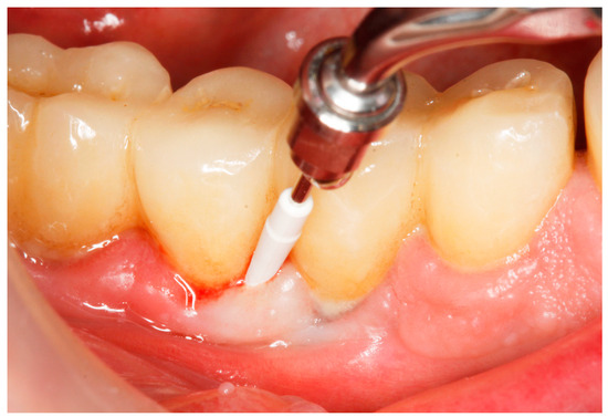 Baseline: Prior to PiM treatment, PMPR was performed in all subjects (Figure 3), for both teeth and implants. Each patient was assigned to one of the two treatment groups according to computer-generated randomization. One implant (the one with the greatest number of BoP points or the presence of a line of bleeding or profuse bleeding) with PiM in each patient was selected for the study. PMPR of the implants of interest was performed using an ultrasonic scaler with a plastic tip (Piezon® Master700 with Piezon® PI instrument, EMS, Nyon, Switzerland), and air polishing (Perioflow® handpiece, Airflow® PLUS powder, EMS, Nyon, Switzerland) was carried out at all sites. Piperacillin plus tazobactam gel Gelcide® (Italmed, Firenze, Italy) was prepared according to the manufacturer’s recommendations and was applied as follows: the solution was injected into the powder container, and the container was shaken until the solution became homogeneous. After mixing, the consistency of the mixture slightly increased, so it could be applied at the implant surface. Instrumentation was followed by subgingival application of the volatile mixture, depending on the patient’s group. For the Gelcide® group (test), topical application of Gelcide® was performed for the placebo group (control), topical application of a placebo (the volatile polymeric carrier alone) was carried out. The necessary quantity (not standardized) was then extracted from the mixed container with a syringe and inserted into the peri-implant sulcus at the apical extremity (Figure 4) until the excess became visible at the mucosal margin. Once the product had been applied, the excess was removed using a cotton ball.