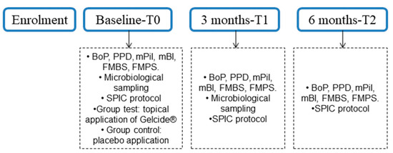 Follow-up visits and reevaluations took place 3 and 6 months (Figure 6) after the initial evaluation. At 3 and 6 months, clinical parameters were re-measured. Microbiological samples were collected at baseline and 3 months. The SPIC protocol was applied at each recall. Participants received conventional professional prophylaxis and air polishing at each reevaluation (3 and 6 months). Oral hygiene instructions were reinforced if necessary. At the first reevaluation, it was checked adverse effects or concomitant use of medication that was against the inclusion criteria were present.