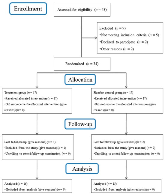 This study was designed as a prospective, double-blinded, randomized, placebo-controlled clinical trial with a parallel design and a 6-month duration. The study was carried out between January 2022 and September 2023. The study’s flow chart is reported in Figure 1, and data are reported according to the Consolidated Standards of Reporting (CONSORT) guidelines.