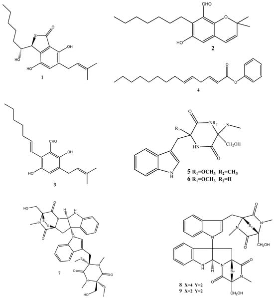 In another work, chetomin (9), isolated from C. globosum (HG423571) obtained from Avena sativa, has displayed a significant activity against multi(methicillin and oxacillin)-resistant S. aureus ATCC 700699, with an MIC value of 0.05 µM [139].