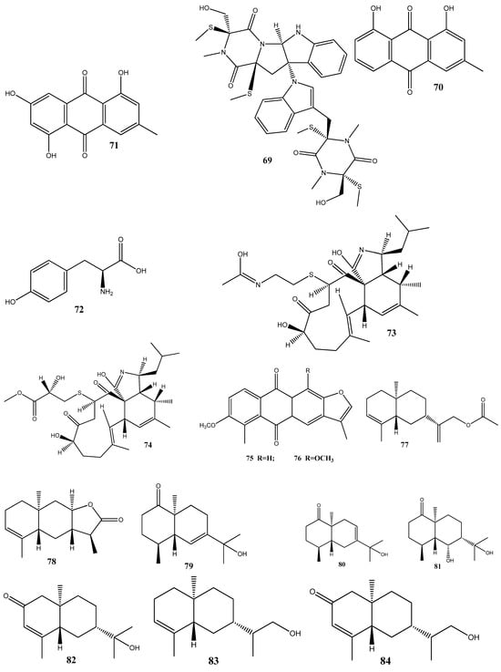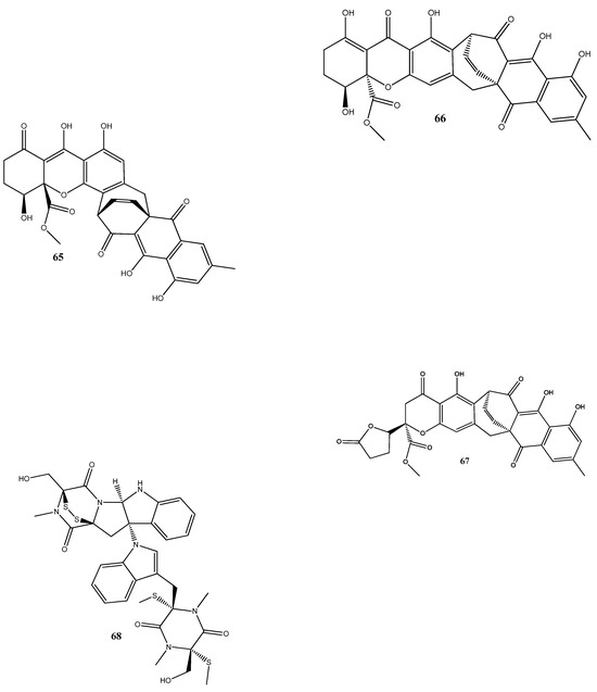Natural compounds isolated from endophytic microorganisms represent a promising alternative to plant-derived compounds, as well as to synthetic and semi-synthetic compounds, for the development of new antibiotics. Many substances isolated from endophytes demonstrate higher antimicrobial activities compared with those of synthetic and plant-derived compounds. In this section, we further discuss the antibacterial activities of recently isolated endophytic compounds (Figure 3) against antibiotic-resistant bacteria. For example, an endophytic fungus Chaetomium globosum 7s-1 isolated from Rhapis cochinchinensis (Lour.) Mart has yielded the following 10 natural compounds: xanthoquinodin B9 (65), xanthoquinodin A1 (66), xanthoquinodin A3 (67), chetomin (9), chaetocochin C (68), dethio-tetra(methylthio)chetomin (69), chrysophanol (70), emodin (58), alatinone (71), and ergosterol (45). Compounds 65, 66, and 67 have shown significant activities against S. aureus and methicillin-resistant S. aureus, with MIC values ranging from 0.87 to 1.75 μM. Moreover, 9 has demonstrated a strong activity against methicillin-resistant S. aureus, with an MIC value of 0.02 pM, which is remarkably lower than that of vancomycin (0.67 μM) [121].