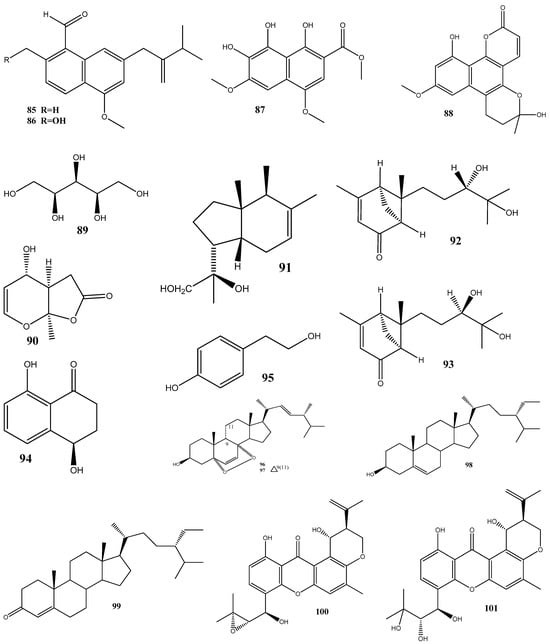 A total of nine natural compounds, seiricardine D (91); xylariterpenoid A (92); xylariterpenoid B (93); regiolone (94); 4-hydroxyphenethyl alcohol (95); (22E, 24R)5, 8-epidioxy-5α, 8α-ergosta-6,22E-dien-3ß-ol (96); (22E, 24R)5, 8-epidioxy-5α, 8α-ergosta-6,9(11), 22-trien-3ß-ol (97); ß-sitosterol (98); and stigmast-4-en-3-one (99), have been obtained from Cytospora sp. derived from the Chinese mangrove, Ceriops tagal. Among these compounds, only 96 has shown weak antibacterial activities against methicillin-resistant S. aureus GIM1.771, with an MIC value of ca. 230 µM [128].