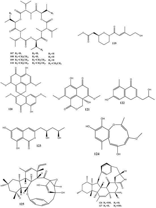 Seven compounds, namely, trichosetin (104), beauvericin (105), beauvericin A (106), enniatin B (107), enniatin H (108), enniatin I (109), and enniatin MK1688 (110), have been extracted from the endophytic fungus Fusarium sp. TP-G1 obtained from Dendrobium officinale Kimura et Migo. The MIC values of these compounds against S. aureus and methicillin-resistant S. aureus were comparable, ranging from 4 to 32 μg/mL [130].