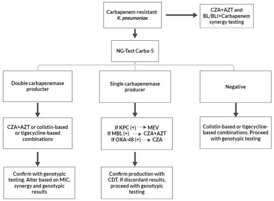 A negative NG-Test Carba-5 result has two possible interpretations: either the isolate is carbapenem-resistant due to non-carbapenemase-related mechanisms or the production of a rare carbapenemase type (e.g., GES carbapenemase), or, alternatively, the result is a false negative. In all cases, genotypic testing is recommended to determine the presence of non-carbapenemase-mediated resistance. Although CZA + AZT could be considered for treatment, polymyxin- or tigecycline-based therapies are recommended pending confirmatory genotypic and MIC results. In all isolated K. pneumoniae isolates, synergy testing with CZA + AZT is recommended due to the high rate of MBL production. Laboratories should consider adding additional antimicrobial synergy testing based on the novel BL/BLI combinations and colistin with carbapenems, aminoglycosides, and fosfomycin for all double carbapenemase producers, as indicated by NG-Test Carba 5, and for all patients with severe diseases. This is based on studies that, although demonstrating no differences in terms of a reduction in mortality between combination and monotherapies, have cited possible indication biases as a cause for the lack of benefit seen from combination therapies in addition to the delays associated with initiating CZA therapies [126].