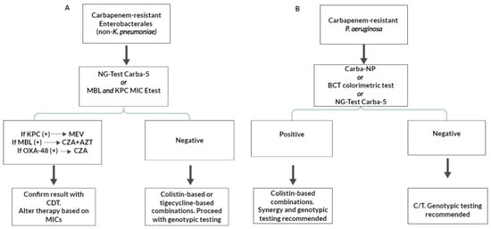 Suggested diagnostic and treatment algorithms for carbapenem-resistant Enterobacterales (non-Klebsiella pneumoniae) (A) and Pseudomonas aeruginosa (B) based on carbapenemase production. KPC: Klebsiella pneumoniae carbapenemase; MBL: metallo-β-lactamase; MEV: meropenem/vaborbactam; CZA: ceftazidime/avibactam; AZT: aztreonam; CDT: combination disc testing; BCT: Blue Carba Test; and C/T: ceftolozane/tazobactam.