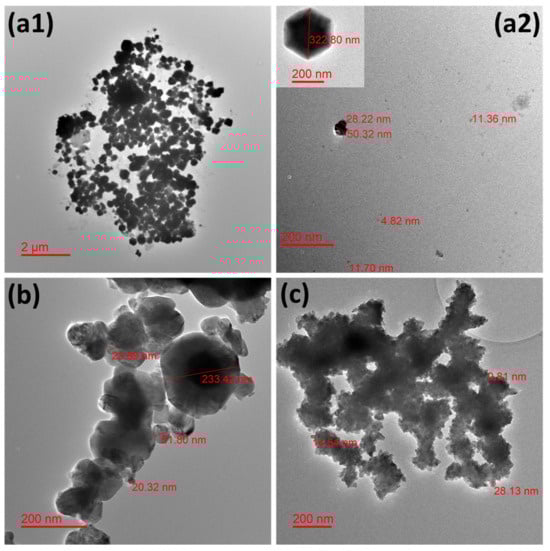 Transmission electron microphotographs showing the morphology of the different studied nanopowders. Micrographs for (a1,a2) electrochemical synthesized cuprite nanopowder, (b) commercial cuprite nanopowder, and (c) commercial copper nanopowder.