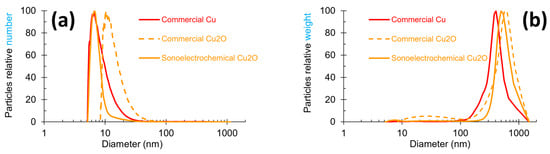 Particle size profiles obtained by centrifugal liquid sedimentation at 22,000 rpm in two modes for the three studied nanopowders: (a) relative number and (b) relative weight mode for sonoelectrochemical Cu2O, commercial Cu2O, and commercial Cu nanopowders.