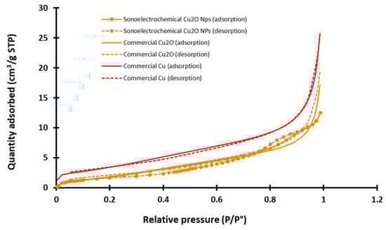Experimental isotherms for the two commercial NPws are nearly reversible, and according to the classification of the International Union of Pure and Applied Chemistry (IUPAC) that distinguishes six different shapes of physisorption [34], they can be classified as type II. It is more complex for the sonoelectrochemical NPw. Indeed, the isotherms have two features of type IV since they exhibit a hysteresis and two inflection points, but the theoretical final saturation of quantity adsorbed is not visible after the hysteresis. Moreover, the adsorption and desorption curves intersect. The type of hysteresis loop is, therefore, uncommon and cannot be identified using the IUPAC classification. This point could be explained by the small quantity of analyzed material, but the exploitation of the graphs makes it possible to extract the specific area value. Therefore, the found value is around 5 and 6 m2·g−1 for sonoelectrochemical and commercial Cu2O, validating the relevance of comparing these two chemical natures of the NPws. With a specific area only double for the copper NPw (12 m2·g−1), the use of this material as a positive standard in antifungal tests also appears relevant.