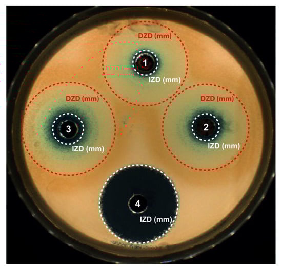 Antifungal activity after 24 h of incubation at 37 °C and exposure to the different nanopowders on Sabouraud dextrose agar seeded with Candida albicans. Results for 2 mg of nanopowder placed in a well and diluted in 30 µL of Sabouraud medium: (1) Cu2O, (2) commercial Cu2O or (3) commercial Cu nanopowder, and (4) bleach used as positive control. Circles around the wells report the growth inhibition zone diameter (white circle) and the growth disturbed zone diameter (red circle).