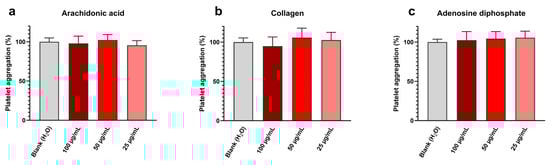 Platelet aggregation assay results are shown in Figure 5 and exhibit at all tested concentrations and with all inducers (i.e., arachidonic acid, collagen, and adenosine diphosphate) a platelet aggregation near the blank one. Detailed values are given in Table 5.