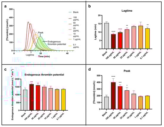 Figure 6a, which presents the thrombin generation curves, clearly shows a shift and an increase in the peak height of the curves linked to the concentration of NPcs. This peak is also getting sharper at the same time. So, the higher the concentration of NPcs, the higher the rate of generated thrombin. The NPcs also allow a reduction in the lagtime (time needed to form the first traces of thrombin). These points are more visible on the histogram’s representations (Figure 6b–d) and are quantified in Table 6.