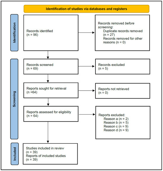 Figure 1 shows the flowchart of the strategy followed to search for the studies selected for this review, according to PRISMA 2020 instructions. The initial search resulted in 96 published studies. After the removal of duplicate studies (n = 27), 69 studies were screened for titles and abstracts, and five that did not investigate antibiotic prescriptions were excluded, leaving 64 for reading the full text.