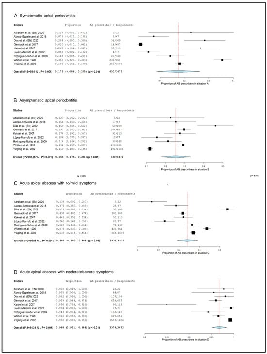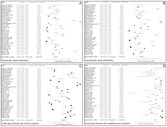 Forest plot of the included studies in the meta-analysis for prescription of antibiotics by endodontists in the treatment of apical disease. (A) Symptomatic apical periodontitis; (B) asymptomatic apical periodontitis or chronic apical abscess; (C) acute apical abscess with no/mild symptoms; (D) acute apical abscess with moderate/severe symptoms.