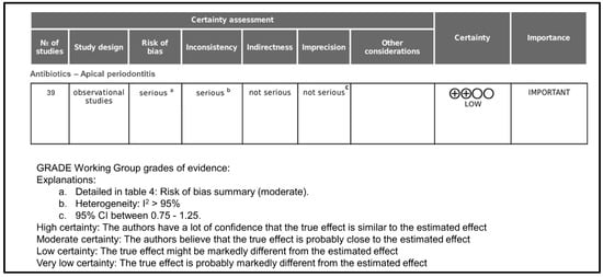 Regarding inconsistency, it was rated as serious because, in all cases, heterogeneity was >95%. Indirectness was rated as not serious because all studies provide direct evidence about antibiotics prescription in apical periodontitis. Imprecision was rated as not serious because the 95% confidence intervals in all cases were between 0.75 and 1.25. As far as publication bias is concerned, it occurs when the publication of research results is influenced, in addition to the quality of the research, by the tested hypotheses and the importance and direction of the results. In the case of surveys on antibiotic prescription, in which the result is objective data, it has not been considered that publication bias could be important. There were no other considerations that modified the degree of certainty, and the final rating for the certainty of the evidence was low.