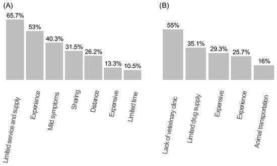 Participants’ reported reasons for not seeking health professionals (A) and veterinary professionals (B) for their livestock.