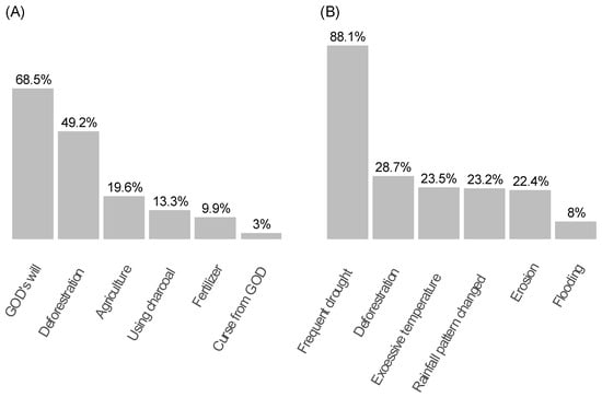 Participants’ reported causes of climate change (CC) (A) and emerging challenges (B) in the past decade.