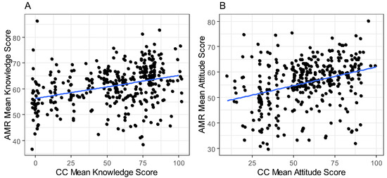Figure 4 illustrates the relationship between the mean knowledge scores of AMR and CC. In Figure 4A, the scatter plot depicts a notable positive trend wherein an increase in the mean knowledge score of AMR corresponds with a concurrent increase in the mean knowledge score of CC. Similarly, Figure 4B portrays a similar positive correlation, wherein higher mean attitude scores of AMR align with elevated mean attitude scores of CC.