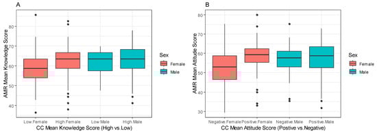 In terms of sex, females who demonstrated a strong comprehension of CC showed a notably high median score in the “AMR Mean Knowledge Score”. Conversely, when their understanding of CC was limited, their median score in the “AMR Mean Knowledge Score” was correspondingly low. In contrast, for males, their median “AMR Mean Knowledge Score” remained relatively constant regardless of their level of comprehension of CC (Figure 5A). Furthermore, both females and males displayed high median scores in the “Mean AMR attitude score” when they expressed a positive attitude towards CC. Conversely, when participants exhibited a negative attitude towards CC, the median “AMR Attitude Mean Score” was low for both genders (Figure 5B).