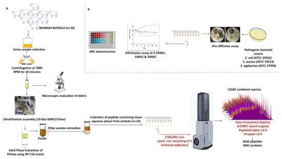 Sample processing, peptide extraction, and confirmation of activity: (A) Urine sample collection, processing, extraction of the peptide from the urine and its analysis using nLC-MS/MS. (B) Functional validation of antimicrobial activity of urinary peptide extract.
