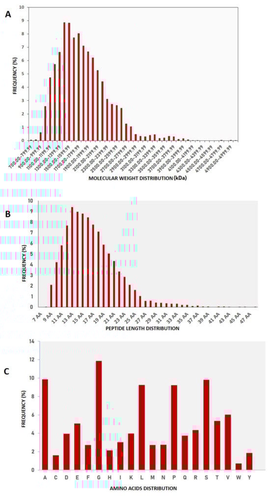 Frequency distribution: (A) Molecular weight, (B) Peptide length, and (C) Compositional amino acids of buffalo urinary peptides.