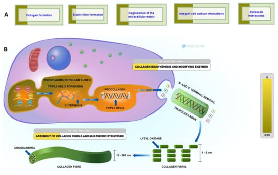 Origin of urinary peptides: (A) Maximum hits obtained in the ECM organization pathway of Reactome, (B) Urinary peptides are ECM derived and involved in biosynthesis of collagen.