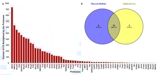Proteases involved in proteolytic events: (A) Frequency distribution of cleavage sequences recognized by the different proteases. (B) Common proteases identified in Murrah buffalo and Sahiwal cow (Reported in our previous work).
