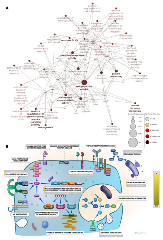 Biological process of proteases: (A) Network depicting proteases (small, white-colored nodes) and corresponding molecular function or activity. The size of the nodes corresponds to the number of mapped genes and the color denotes the significance of the GO term. (B) The number of genes mapped to different functions of the innate immune system in Reactome; four genes were mapped significantly to antimicrobial peptides, with 3.85 × 10−2 FDR.