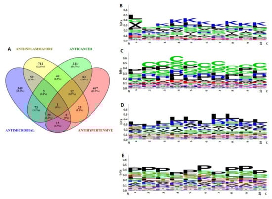 Predicted bioactivities of peptides: (A) Venn diagram showing unique and shared peptide sequences by different predicted bioactivities. N terminal (10 amino acids) sequence logos: (B) Antimicrobial peptides, (C) Anticancer sequences, (D) Anti-inflammatory sequences, (E) Antihypertensive sequences.