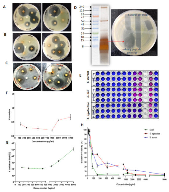 Antimicrobial and cytotoxicity assays: Disc diffusion assay of urinary peptide extract against (A) S. agalactiae, (B) S. aureus, and (C) E. coli. (D) Visualization of the extracted urinary peptide using tricine SDS-PAGE and confirmation of antimicrobial activity of urinary peptide by overlaying the unstained gel strip over inoculated agar surface. (E) Broth microdilution assay in conjunction with resazurin dye. (F) Percent hemolysis exerted by urinary peptide on the RBCs. (G) Cytotoxicity exerted by urinary peptide on BuMEC cell line. (H) Determination of bacterial viability in the concentration-dependent manner of urinary peptide extract.
