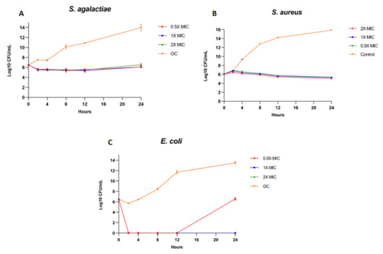 Kill kinetics curve of urinary peptide extract against: (A) S. agalactiae, (B) S. aureus, and (C) E. coli.