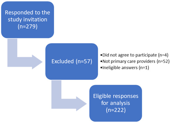 We constructed a new questionnaire adapted from an earlier questionnaire that assessed antibiotic appropriateness [12]. A panel of experts evaluated and validated the questionnaire. Eleven primary care providers assessed the readability and clarity of the questionnaire. Based on the pilot study, the questionnaire was modified and refined to the final version, which consisted of 34 questions that assessed five main domains (demographic data, knowledge and attitude toward topical antibiotic use, practices of antibiotic prescribing, accessibility and use of antibiotic therapy guidelines, and appropriateness of topical antibiotic prescription for the most common indications. We published an online Google Forms questionnaire from December 2022 to February 2023. In addition, the authors visited several primary clinics and distributed the questionnaires to family medicine physicians. Ineligible participants were excluded, as shown in the study participation diagram (Figure 1).
