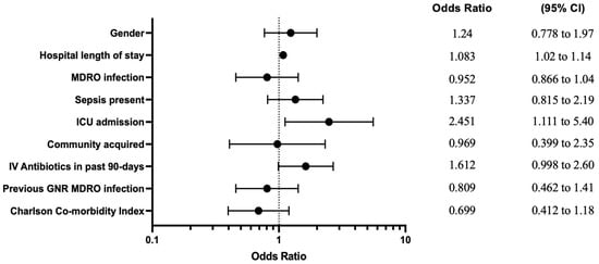 To determine any factors that might be predictive of patients requiring regimen modifications, multiple logistic regression with various models was used to identify risk factors that could potentially influence therapy modifications, including the MDRO status, which was univariately associated with modifications. In this analysis, the only variables associated with therapy modification were infection-related admission to the ICU and hospital length of stay, per the GEE and mixed-effects models. The representative forest plot (Figure 1) from the GEE model is likely the best fit model for this study population, as we are able to include all patient encounters and the GEE model makes fewer assumptions about the correlation structure between repeated measurements compared to traditional and mixed models [20]. Patient-specific risk factors that would be available to review and act upon at admission to the hospital, including previous antibiotic use and hospitalization in the past 90 days and previous MDRO infection, were included in the multiple logistic regression, but there were no significant associations.