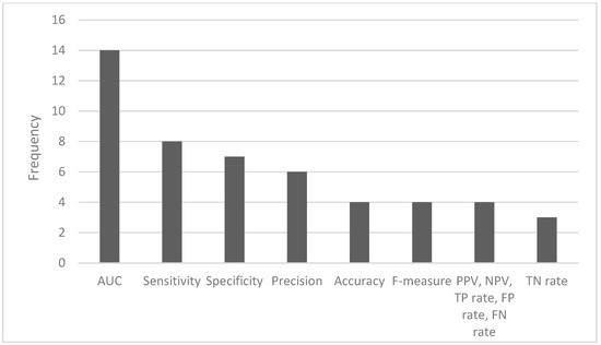 Frequency of the most used performance metrics (AUC—area under the curve; PPV—positive predictive value; NPV—negative predictive value; TP—true positive; FP—false positive; FN—false negative; TN—true negative).