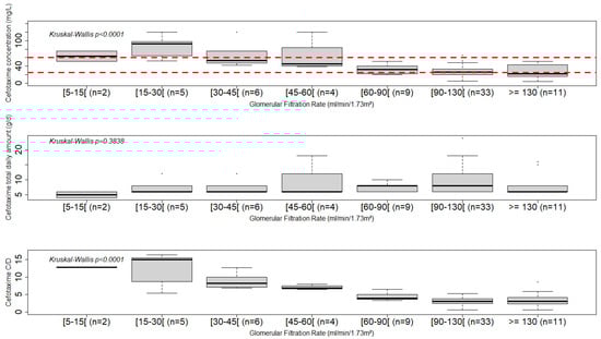 Figure 1 shows the initial concentrations, total daily doses and C/D ratios of cefotaxime as a function of GFR. Cefotaxime concentrations were significantly different according to GFR (Kruskal–Wallis test, p < 0.0001), with 64 ± 17 mg/L (median = 64 mg/L) at GFR between 5 and 15 mL/min/1.73 m2 to 27 ± 16 mg/L (median = 22 mg/L) at GFR above 130 mL/min/1.73 m2. The time between the administration of cefotaxime and its monitoring did not differ significantly by GFR level (p = 0.8775), with a median delay of 38.5 h after initiation.