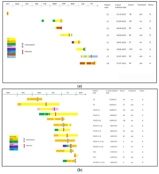 (a) C. auris dynamics outside the outbreak. C—case; Date dd/mm/yy; W—wound culture; ET—endotracheal tube secretions culture; UR—urine culture; CVC—central venous catheter; BC—blood culture; ICU—intensive care unit; CVS—cardio-vascular surgery ward; ID—infectious diseases ward; HEM—haematology ward; IM—internal medicine ward; CARD—cardiology ward; GS—general surgery ward; PS—plastic surgery ward; D—deceased; A—alive. (b) C. auris outbreak dynamics. P—patient; Date dd/mm/yy; W—wound culture; ET—endotracheal tube secretions culture; UR—urine culture; BC—blood culture; S—skin carrier; ICU-CVS—cardiovascular surgery associated intensive care unit; CVS—cardio-vascular surgery ward; ID—infectious diseases ward; HEM—haematology ward; IM—internal medicine ward; CARD—cardiology ward; D—deceased; A—alive.